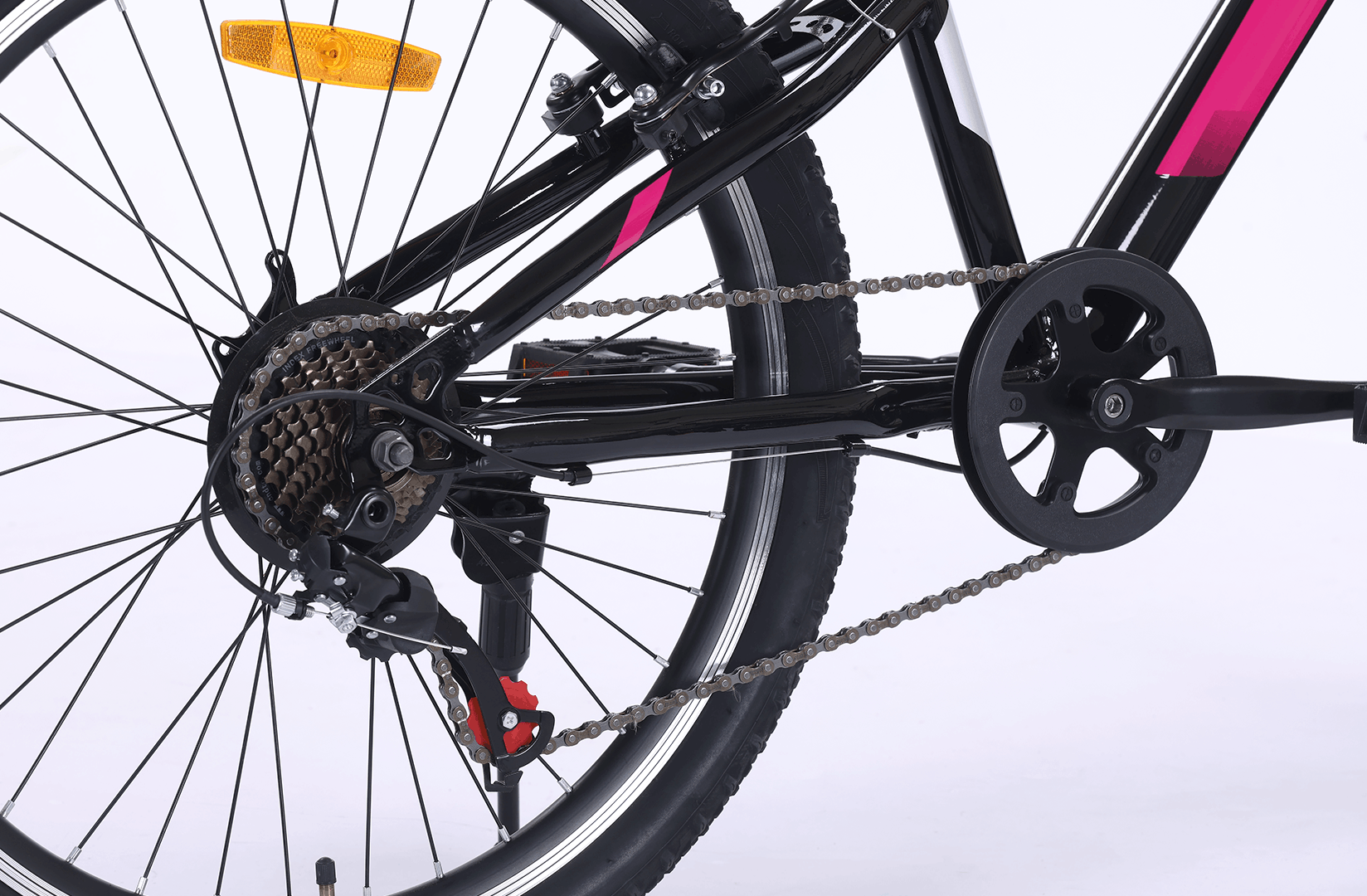 The ergonomic saddle and pedals with reflectors enhance comfort and safety, while the 24" × 2.125" wheels ensure stable and smooth rides.